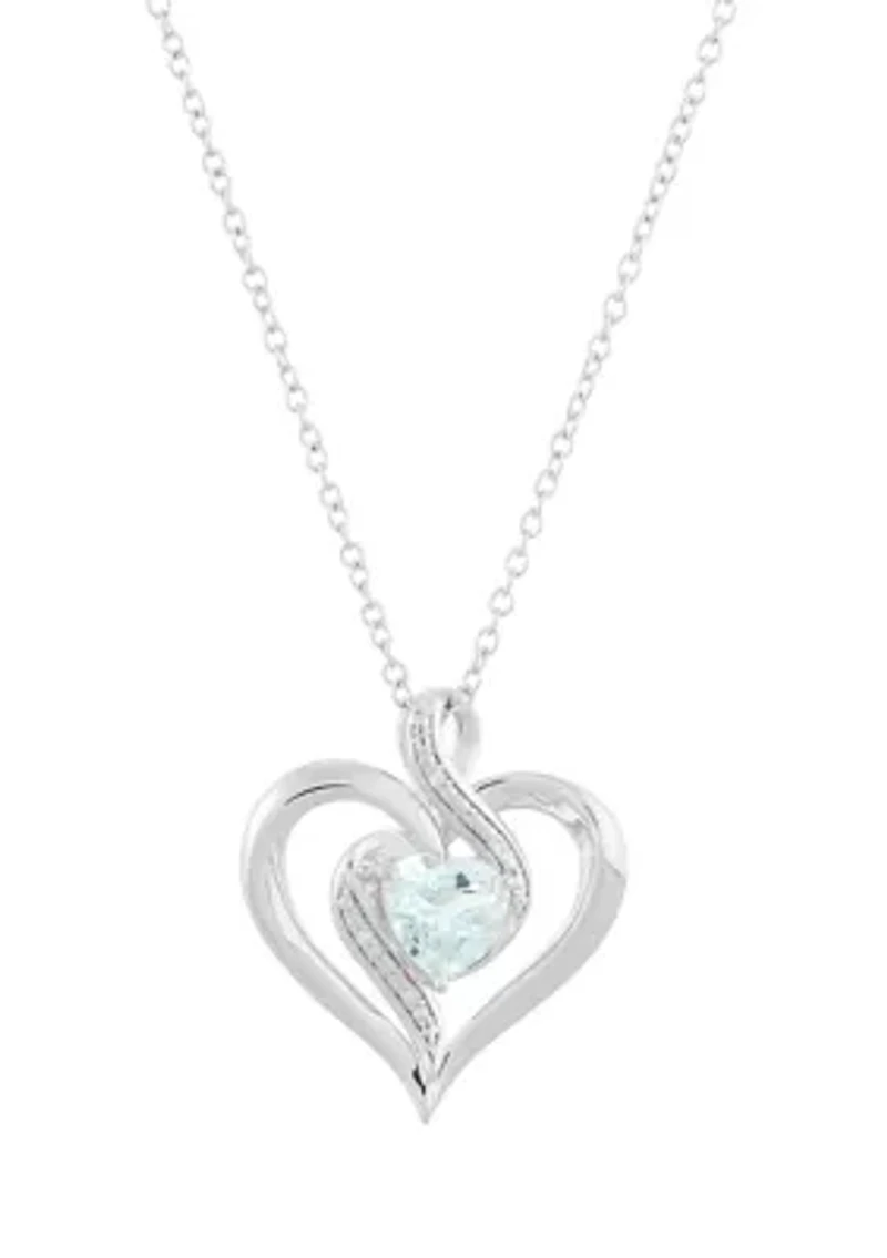 1/10 ct. t.w. Diamonds surround a stunning Aquamarine center stone on the heart-shaped pendant of this glittering Belk & Co. necklace. 4 Diamonds, 1 Aqua Spring ring clasp Color rating: I Clarity rating: I3 Polished finish Prong setting Imported Belk Exclusive Product Specifications 18.84" L x 0.75" W x 0.84" H 1/10 ct. t.w. Diamond Material & Care Sterling silver Clean with a soft cloth