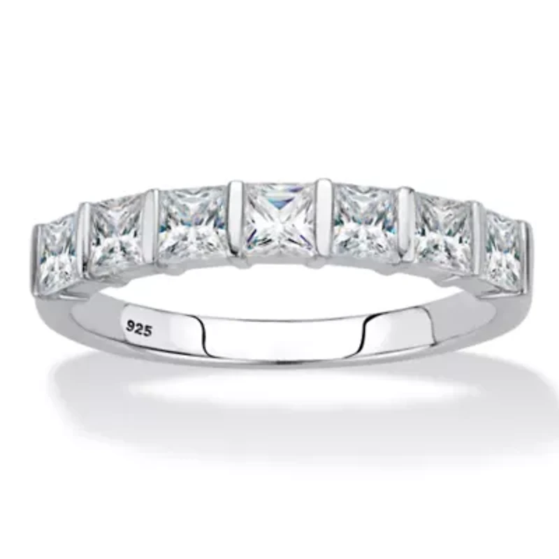 Simple elegance and dazzling sparkle, this bar-set ring features a single row of channel-set princess-cut cubic zirconia stones. This beauty makes a beautiful wedding band or anniversary ring with 1.12 carats T.W. Set in shining platinum-plated sterling silver, it's available in sizes 6-9. Main Stone: 7 Princess Faceted Cut Cubic Zirconias, 1.12 carats total weight, 3 mm x 3 mmPlatinum-Plated Sterling Silver; Contains 1.70 grams of Sterling SilverMeasures: 21 mm wide x 3 mm long x 2.75 mm high; Shank Width: 2.0 mm wideIncludes gift box and drawstring pouchPlatinum-Plated Sterling SilverContains 1.70 grams of Sterling SilverShank Width: 2.0 mm wideDimensions: 21 mm wide x 3 mm long x 2.75 mm highIncludes gift box and drawstring pouch 7 Polished finish Warranty available China Imported Product Specifications 0.94 in x 0.12 in x 0.83 in 1.12 Material & Care Metal, Sterling silver Clean with a soft cloth.