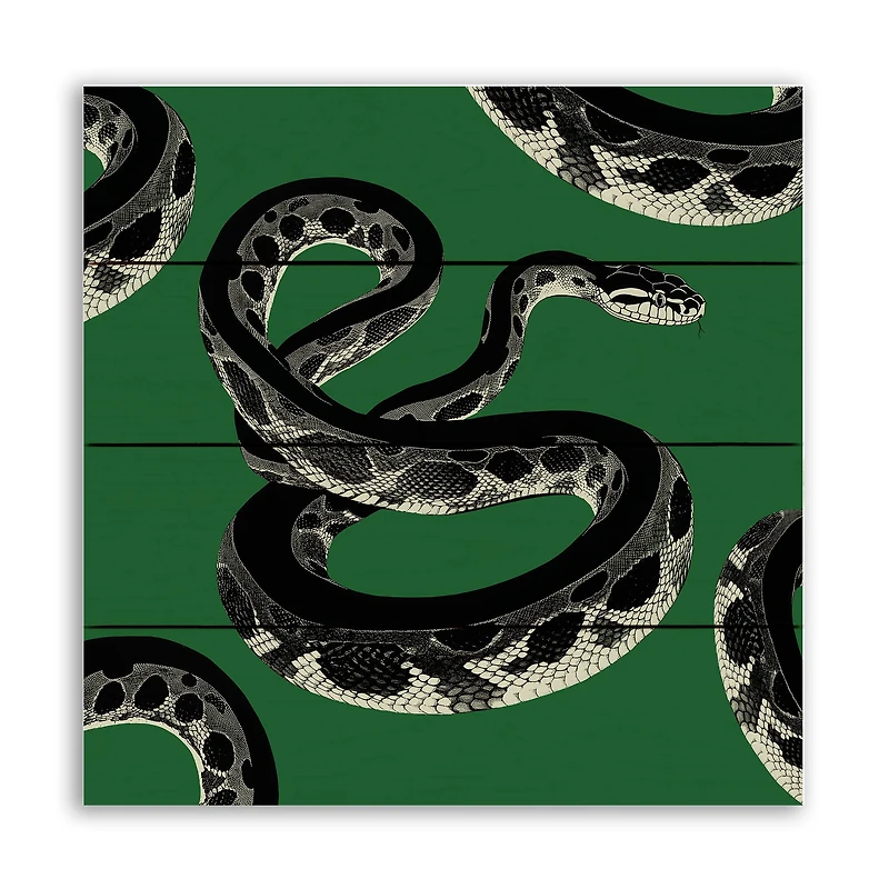 Elevate your home décor with this charming pallet wood snake wall art. It is designed to add character and intrigue to any space.Details:Green and black11.75" x 0.75" x 11.75"Slatted pallet wood with sturdy back constructionEffortless installation with included sturdy sawtooth hangerPrinted on high-quality, whitewashed Baltic birch plywoodFor indoor use