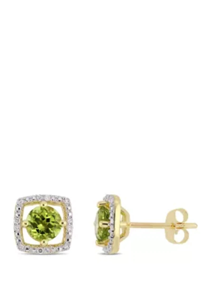 These beautiful modern square stud earrings from Belk & Co. are crafted in yellow gold and feature round-cut 1.2 ct. t.w. peridot gemstones and 24 sparkling 0.07 ct. t.w. diamonds in a unique halo design. 1.2 ct. t.w. Peridot 24 0.07 ct. t.w. Diamonds Color rating: H Clarity rating: I2-I3 Post back closure Prong setting Polished finish Imported Belk Exclusive Material & Care 10K Yellow Gold Use gold polishing cloth on gold items