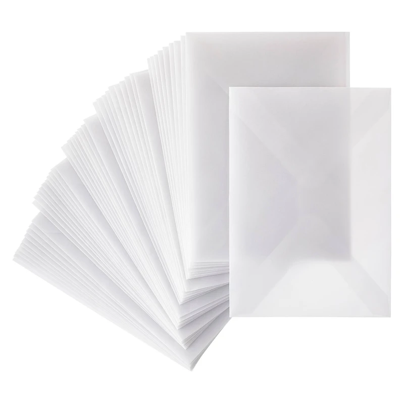 Enclose your formal correspondence and handmade cards in these classic vellum envelopes from Recollections. Featuring a fine translucent material and glue seal, these envelopes are ideal for shower and wedding invitations or any stationary that calls for a lovely touch of simplicity. They can also be easily embellished to fit your theme using paints, markers, stickers and more!Details:Translucent white5.25" x 7.25" (13.3cm x 18.4cm)113 gsm12 packs (50 envelopes per pack, 600 total envelopes)Glue sealVellum and gum