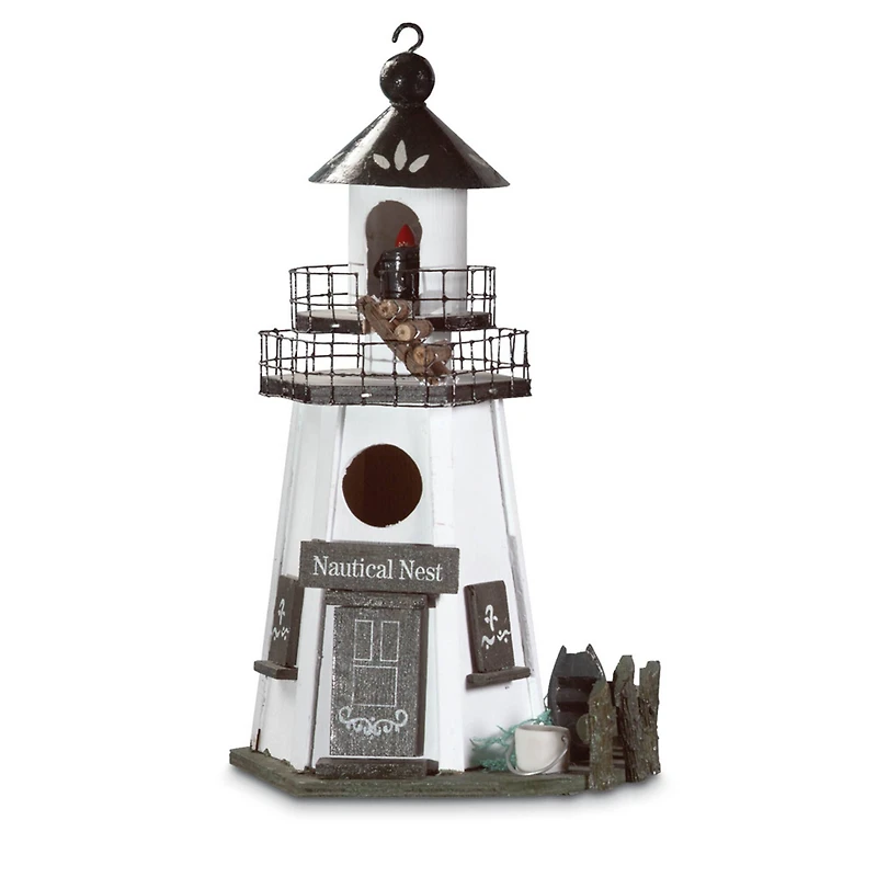 This birdhouse is perfect for a pair of nesting birds! Made from eucalyptus wood to create a sturdy and decorative home for your feathered friends. This quaint nautical themed birdhouse is a snug shelter and an enchanting adornment for your garden. Either hung from its loop or rested on an elevated surface outside, this birdhouse provides a quirky and cozy home for local birds as well as amusing and enjoyable for décor for yourself.Details:Black and white7.25" x 5.25" x 12.25"WoodTo clean, remove nesting materials through hole in back and wipe with a damp clothFor indoor and outdoor use