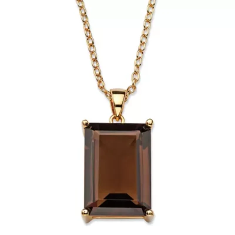 The warm rich hue of smoky quartz is stunning in this emerald-cut necklace. Fit for a queen with a faceted 12.50 carat genuine smoky topaz stone, this is a purely elegant piece with heirloom quality. Hangs from a 16" length cable chain and plated in 14k gold. Main Stone: 1 Emerald Faceted Cut Genuine Smoky Topaz, 12.50 carats, 16 mm x 12 mm14k Gold-Plated; Includes 14k Gold-Plated ChainPendant: 12 mm wide x 16 mm long x 8 mm high; Chain: 1 mm wide x 16 inches long x 2 mm high, plus 2 inch extensionIncludes gift box and drawstring pouch14k Gold-PlatedIncludes 14k Gold-Plated ChainPendant Dimensions: 12 mm wide x 16 mm long x 8 mm high, Chain Dimensions: 1 mm wide x 16 inches long x 2 mm high, plus 2 inch extensionIncludes gift box and drawstring pouch 2 No clasp, 1 Polished finish Prong setting Warranty available, Fullreplacement warranty, 30 Days China Imported Product Specifications 16" length 0.08 Material & Care Metal, Gold plated Clean with a soft cloth.