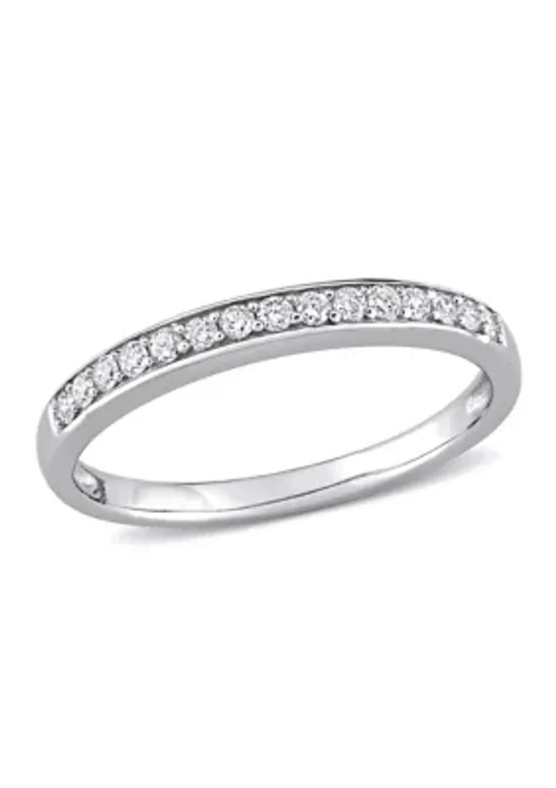 Express your love with this pretty 1/4 ct. t.w. Diamond Semi-Eternity Wedding Band from Belk & Co. Crafted in lustrous 10K White Gold, this ring features 15 round-cut, pave-set white Diamond accents along the band. This ring is enhanced with a high polish finish. 15 Diamonds Color rating: G, H Clarity rating: I2-I3 Slip-on Pave setting Polished finish 1-year warranty Imported Belk Exclusive Product Specifications 2.4 mm Width 1/4 ct. t.w. Diamond Material & Care 10K White Gold Clean with a soft cloth