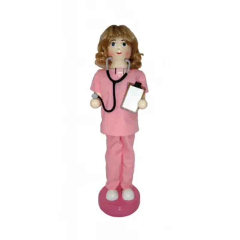 This nurse 14" nutcracker is the perfect gift. She is ready to help patients dressed in her pink scrubs. She has a stethoscope and chart for notes. She is standing on a dark pink round base.