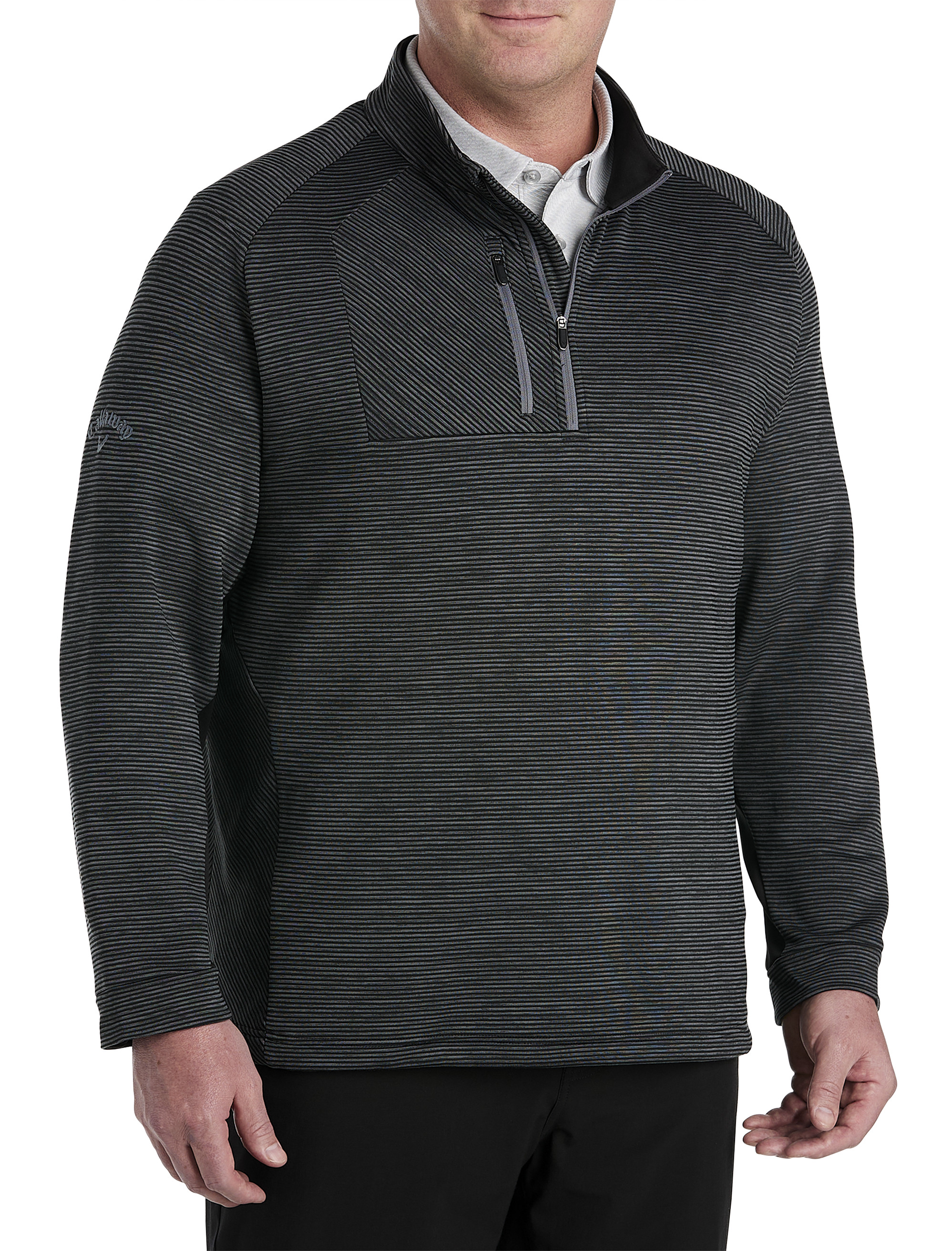 Face a windy fairway in stylish comfort with this versatile, striped quarter-zip pullover from Callaway. As part of their Weather Series™ collection, the lightweight fleece style provides a layer of warmth while the ottoman fabrication adds a textured, ribbed feel for comfort and style. Insulated thermal fabric creates a barrier between you and the cold and Opti-Dri™ moisture-wicking technology keeps you dry. Swing Tech™ technology delivers a full range of motion so you can bend, swing and step without restriction, making it a must-have for days on the golf course or around town.
