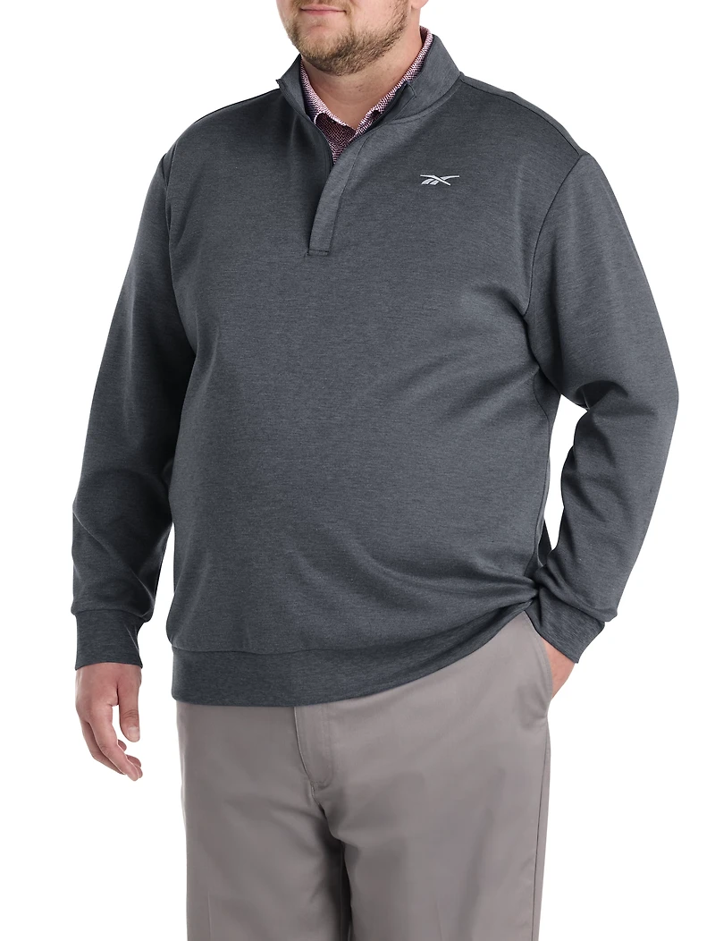 An indispensable layer on and off the golf course, the court or the field, this mid-weight Reebok quarter-zip heathered pullover is sized to fit easily over a tee or polo shirt. Crafted in a soft fabric blend, it wicks away moisture to keep you feeling dry and comfortable and allows for the freedom to move without restriction so you can move through your day with ease. The versatile style easily pairs with jeans, twills, chinos or joggers for a complete look.