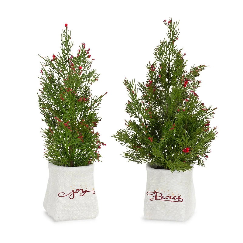 Ring in the holiday season with this beautiful set of Potted Pine Trees. Featuring two assorted designs including "Joy" and "Peace", this set is sure to add an elegant touch of nature to your home décor. The varigated pine branches paired with the berry accents and sentiment pot is the perfect combination to create a stunning Christmas display. Place these trees in your entryway or front porch to welcome your guests in style.Details: Green, white and red 14.25" and 16.5" Set of 2 potted trees Plastic For indoor or covered outdoor use