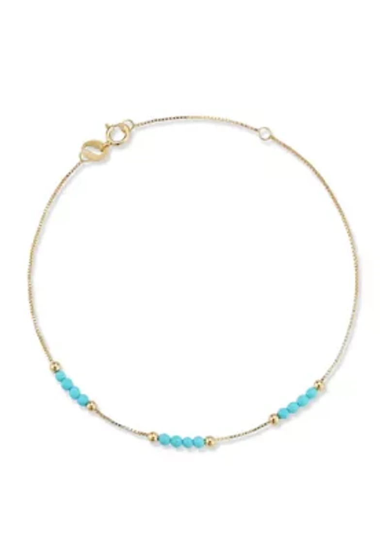 A vibrant pop of color, the Ember Fine Jewelry 14K Gold Turquoise Station Bracelet, made in Italy, features three sets of turquoise beads arranged side by side along a polished 14K gold chain. The smooth gold and vivid blue-green stones catch the light beautifully, creating a subtle, elegant shimmer. Playful yet refined, this bracelet offers a stylish statement perfect for everyday wear or layering with other bracelets. BASE METAL: 14K Gold. BRACELET LENGTH: Approx. 6.5in + 1in extension. CLOSURE: Spring ring clasp. 1 bracelet Spring ring clasp Polished finish Italy Imported Product Specifications Approx. 6.5in bracelet length + 1in extension Material & Care Gold Use gold polishing cloth on gold items.