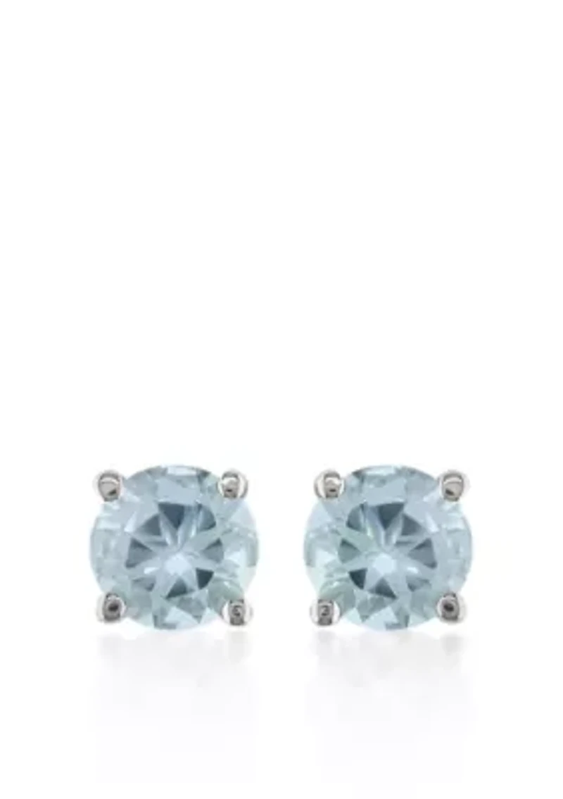 These 14k white gold stud earrings feature 4/5 ct. t.w. round shape aquamarine and measure 5mm in length and 5mm in width, secured with butterfly backs. Almost all gemstones have been treated to enhance their beauty and require special care. Prong Setting 2 Aquamarine Imported