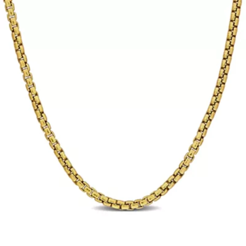 This yellow plated sterling silver necklace features a 1.4 millimeter box link design that combines bold presence with elegant sophistication. The smooth, polished links reflect light beautifully, offering a warm glow and refined finish. Durable and comfortable, it sits naturally along the neckline, transitioning effortlessly from everyday wear to elevated occasions. Available in multiple lengths, this versatile piece can be worn alone for a statement of classic elegance or layered to create a personalized, dynamic look, making it a timeless addition to any jewelry collection. Spring ring clasp Polished finish Warranty available, 60 days Italy Imported Product Specifications 20" Material & Care Sterling Silver Metal, Sterling silver Clean with a soft cloth.