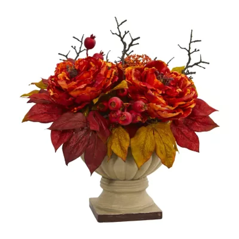 The thick red and green leaves on this peony sedum arrangement add to this artificial arrangement's volume. Orange like the setting sun, the peony's blooms are large and bold atop the bed of lifelike leaves. It is an excellent choice for a bold centerpiece.