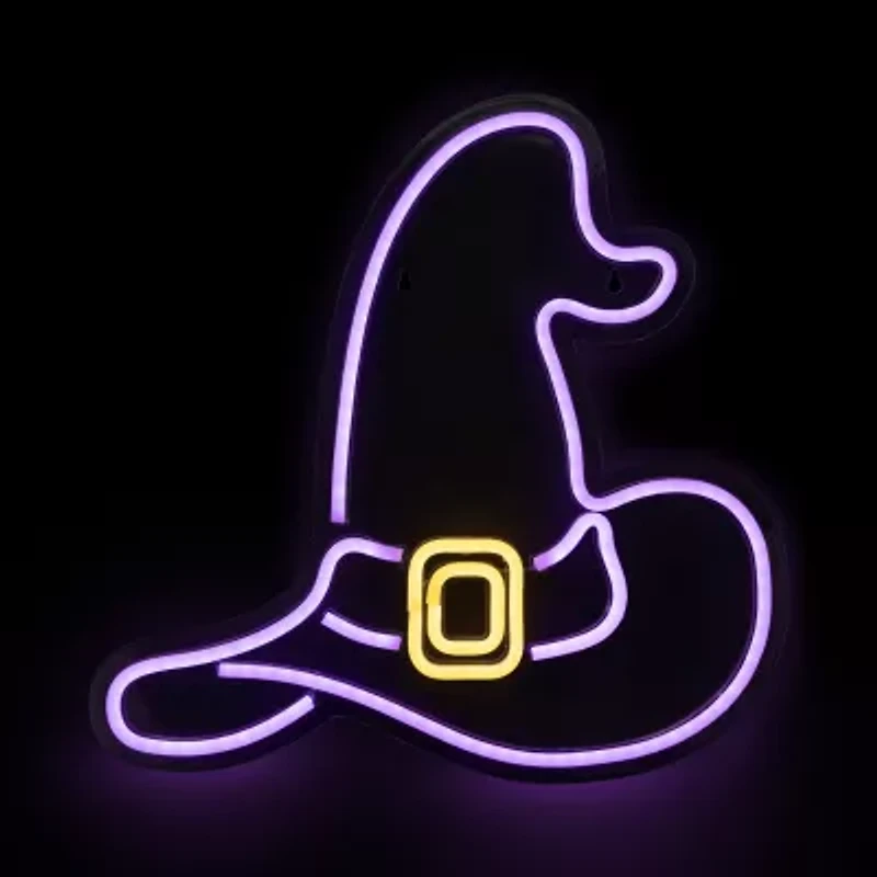 Freshen up your holiday decor with this modern neon style witch's hat silhouette. Vibrant bulbs add light and color. The perfect statement piece for walls or windows. Easy installation makes Halloween decorating a breeze. Features: Color: purple/yellow. One-sided design. Bulbs stay cool to the touch. LED lights use 90% less energy. 6ft lead cord. Product Features: Super bright and vibrant tubes. UL certified and approved for indoor use only. Cannot be connected together with other lighted items. Comes ready-to-hang from 2 keyholes on each side. Class 2 power supply. Powered by USB - power plug included. Input: 100-240 volts 50/60 hertz.35 amps. Output: 5 volts 1 amps. Dimensions: 15"H x 15.25"W x.75"D. Material(s): PVC/wire/metal. Note: Suction cup not included