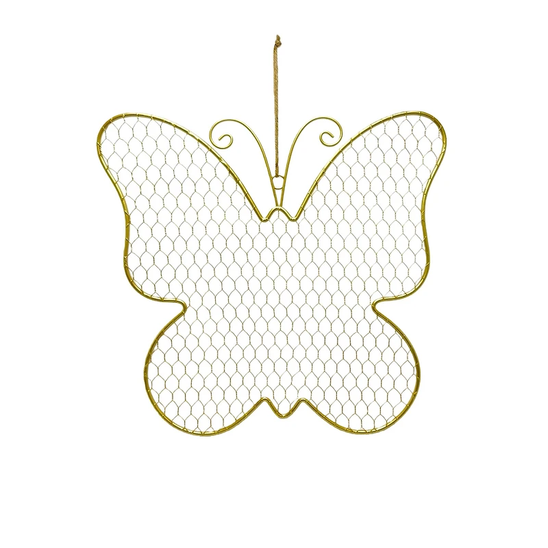 Give your springtime decorating a touch of outdoor charm with this wreath form from Ashland. Featuring a butterfly shape with chicken wire, embellish with faux flowers, yarn and fabric and hang above your mantel to welcome the warmer seasons into your home.Details:Gold colored15.4" x 14" x 0.2" (39.1cm x 35.6cm x 0.5cm)Iron and juteFor indoor use