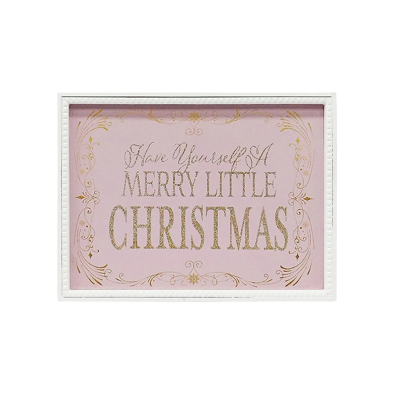 Bring a magical flourish straight from a fairytale to your holiday decorating with this shimmering framed wall sign from Ashland. Featuring glittery iridescent text that reads "Have yourself a merry little Christmas," this eye-catching piece will look right at home hung alongside festive candy-hued nutcrackers and a pretty arrangement of pastel blooms in your living room for the Christmas season.Details:Pink with iridescent glitter text in white frame11.81" x 0.98" x 15.75" (30cm x 2.5cm x 40cm)Fir and MDFHardware attached for hangingComplies to TSCA Title VIRecommended for indoor use only
