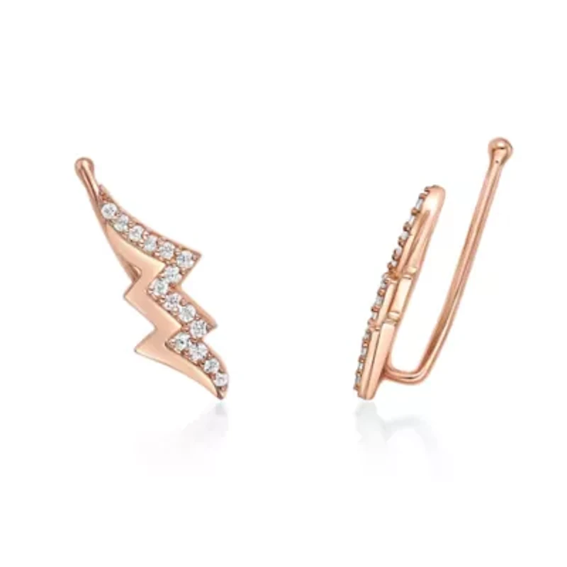 Make a bold statement with these lightning bolt crawler earrings, crafted in gold-plated sterling silver and accented with round diamonds totaling 1/6 cttw. Designed to hug the ear with sleek, modern style, these sparkling earrings add an edgy yet elegant touch to any look. Also available in three color options, including rose-tone, gold-tone and classic silver. 2 pieces 30 Color rating: I, H Clarity rating: I2-I3 Polished finish Prong setting India Imported Product Specifications 19mm x 6mm 0.15 Material & Care Gold Plated Metal, Gold plated Use silver polishing cloth on silver items.