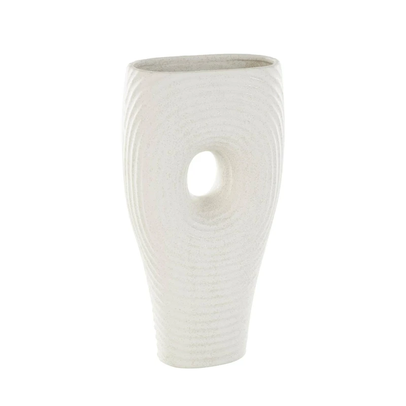 Embrace artistic expression with a style that highlights bold designs with sleek lines, neutral elements, and a minimalist aesthetic. Crafted from ceramic, this white decorative vase offers durability and timeless appeal. Round home décor vase carries a sandstone white finish, adding elegance to any space. Abstract cutouts and speckled texturing on this ceramic vase add depth and visual interest to its design.Details:White8" x 3.75" x 15.63"Weighs 5 lb.CeramicFor indoor use only