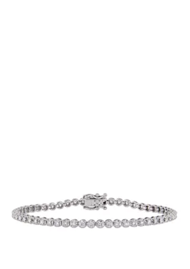 This gorgeous Belk & Co. bracelet is crafted in 14k White Gold and features a total of 55 bezel-set glistening 1.63 ct. t.w. Diamonds in a stunning tennis design. Instantly add a touch of elegance, sophistication, and style to any ensemble with this beautiful bracelet. 55 Diamonds Color rating: H, I Clarity rating: I3 Box clasp Bezel setting Polished finish 1-year warranty Imported Belk Exclusive Product Specifications 1.63 ct. t.w. Diamonds 3.3 mm W x 7 in L Material & Care 14k White Gold Clean with a soft cloth