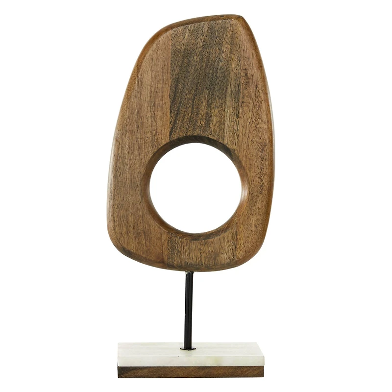 Elevate your modern home with this wood and marble sculpture. This abstract wooden sculpture features a round hole in the middle. Made from mango wood, this sculpture flaunts a smooth, natural brown finish, highlighting the wood grain. This piece stands on a square white marble and wood base. Place it on accent tables or shelves to highlight the minimalist feel of modern style interiors. With its minimalist vibe and natural wood grains, this sculpture will accentuate your modern living room interior.Details:Brown18" x 8" x 4"Mango wood and marbleFor indoor use only