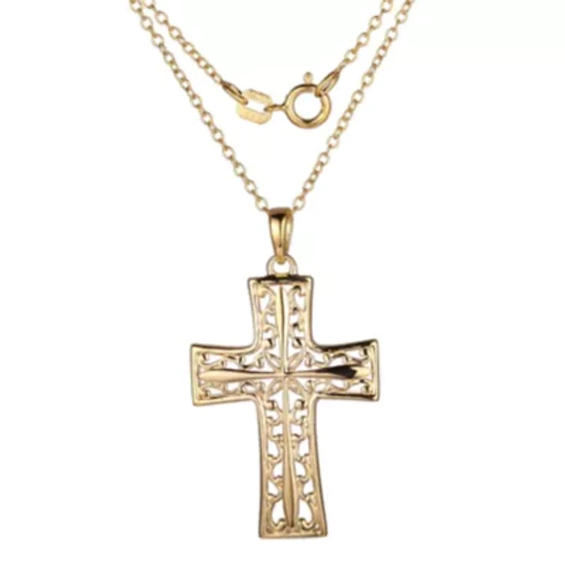 18K gold plated sterling silver cross pendant with a decorative filigree design. This cross pendant comes complete on an 18" cable chain with a spring ring closure. Spring ring clasp Polished finish Imported Product Specifications Chain Length: 18" Material & Care Metal, Sterling silver Clean with a soft cloth.
