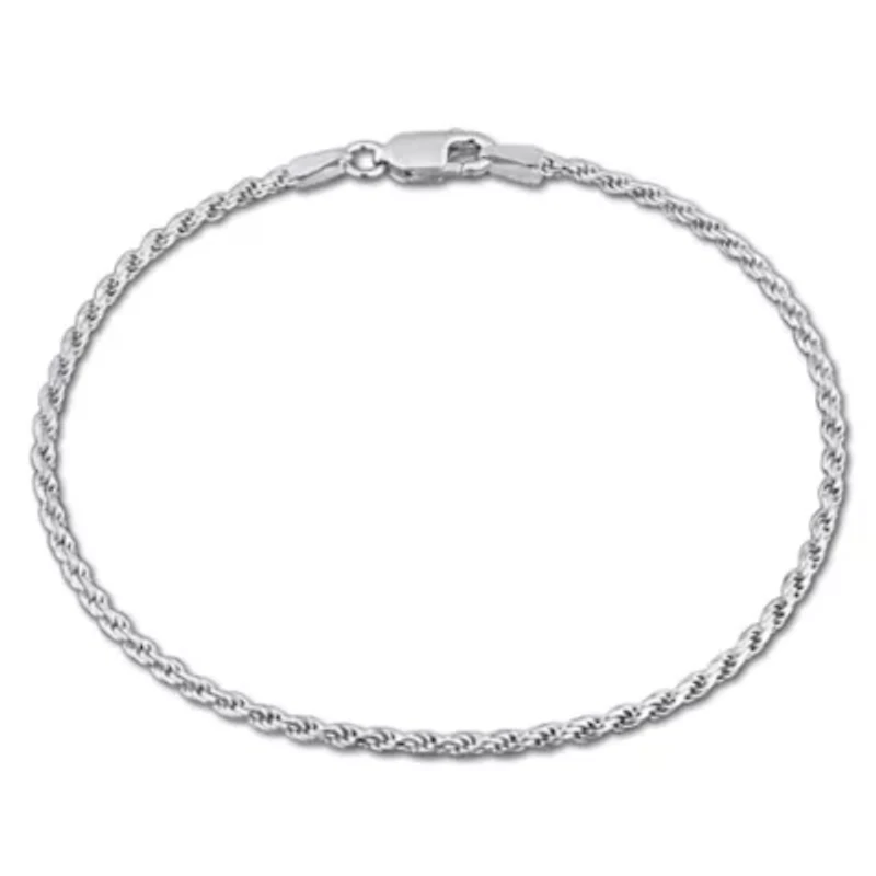 Radiating subtle sparkle, this sterling silver bracelet features a finely crafted diamond-cut rope chain that twists elegantly for a polished, textured look. Designed to drape comfortably along the wrist, it combines durability with refined style. Available in both white and yellow silver, this versatile piece can be worn alone for understated sophistication or stacked with other bracelets for a layered, personalized appearance, making it a timeless addition to any jewelry collection. Lobster closure Polished finish Warranty available, 60 days Italy Imported Product Specifications 7.25" Material & Care Sterling Silver Metal, Sterling silver Clean with a soft cloth.