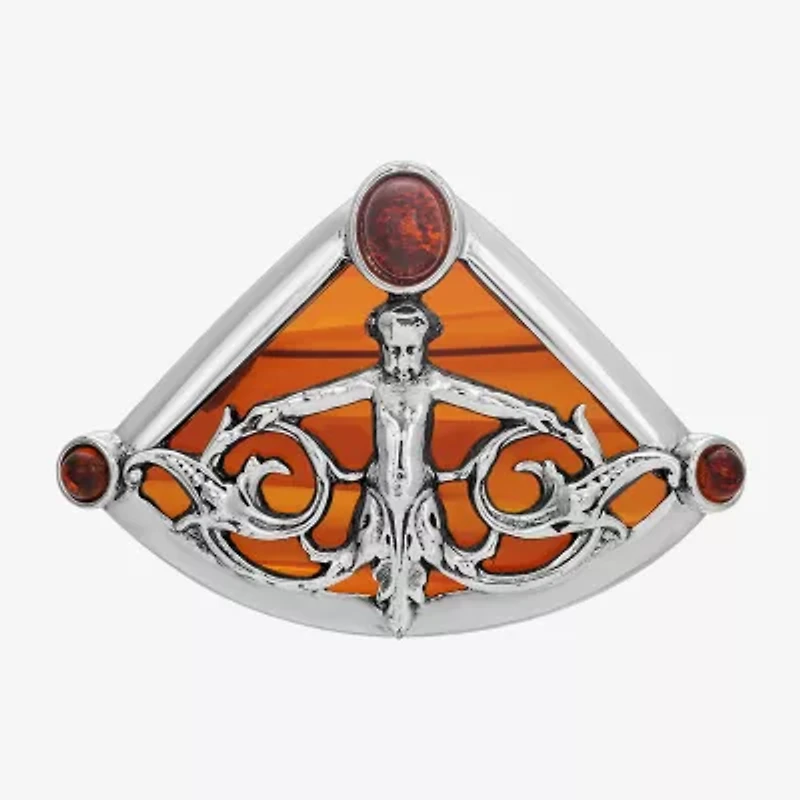 Truly a unique head-turner, this triangle shaped pin features an heirloom quality silver tone frame with a cherub supporting vines, 3 oval cabochons and tortoise backing.