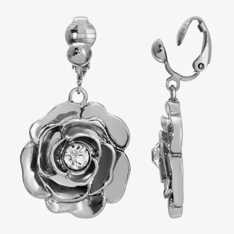 1928 Silver Tone Womens Crystal Flower Clip On Earrings