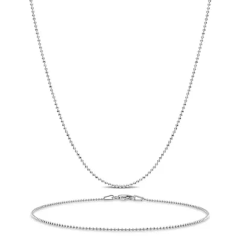 Keep your look effortlessly polished with this sterling silver ball chain necklace and anklet set. Designed with a delicate 1mm profile, each piece offers a subtle shimmer that catches the light with every movement. The coordinated set includes a 16-inch necklace and a 9-inch anklet, perfect for creating a cohesive, minimalist style. Ideal for layering or wearing on its own, this set blends simplicity with modern elegance, adding a refined touch to any outfit. 2 Lobster closure Polished finish Warranty available, 60 days Italy Imported Product Specifications 16", 9" Material & Care Sterling Silver Metal, Sterling silver Clean with a soft cloth.