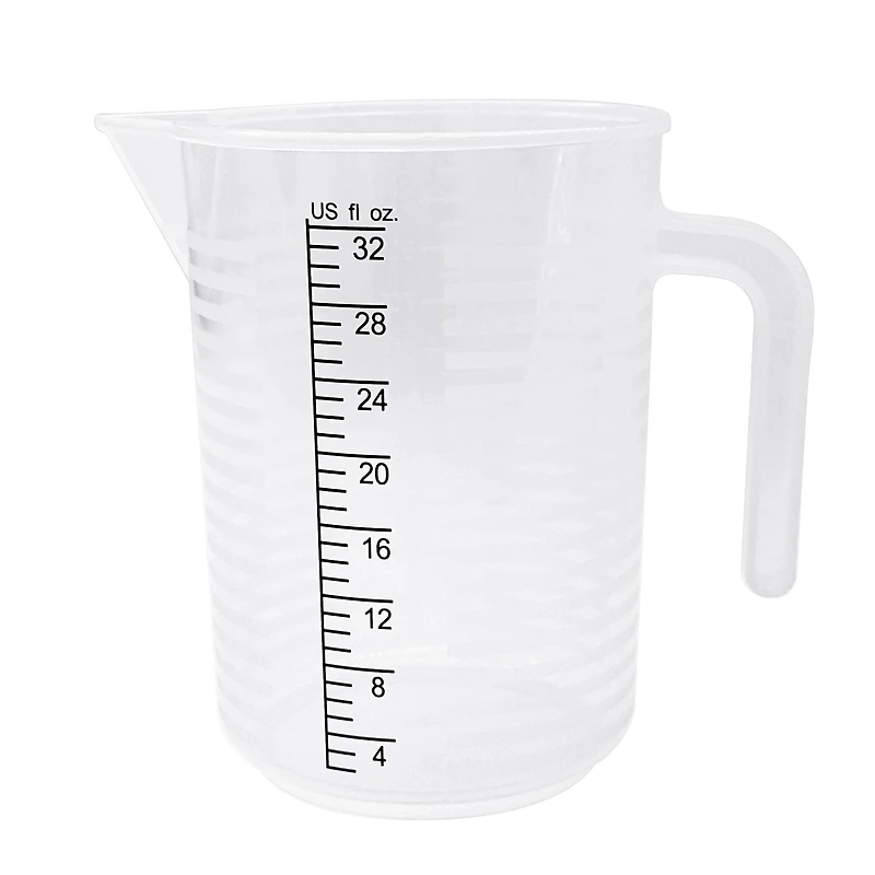 Featuring markings for both fluid ounces and milliliters, a pointed spout, and an easy to grip handle, this clear pouring pitcher is ideal for paint pouring, color mixing, bottle filling and more.Details:Clear1 qt. (946 mL)Plastic