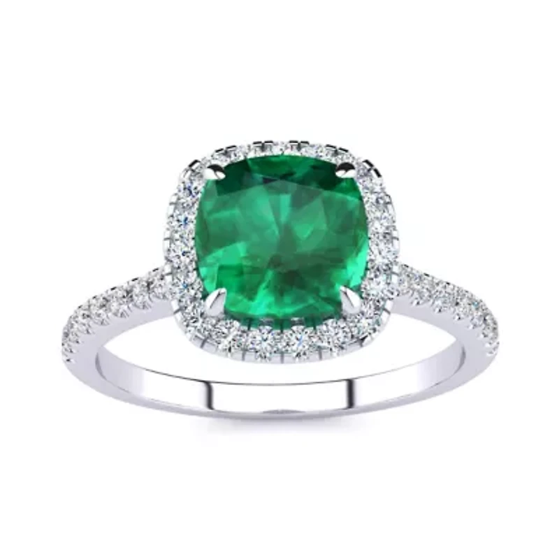 This emerald ring features one 7mm cushion cut created emerald gemstone. It is surrounded by 38 sparkling diamonds totaling 1/2 carat in I-J color, I1-I2 clarity. Total carat weight is approximately 2 carats. This ring is in sterling silver. 39 Color rating: I Clarity rating: I1-I2 Polished finish Prong setting Choking hazard Warranty available, Limited liability warranty, 60 Days China Imported Product Specifications 9x9mm 2 Carats Material & Care Metal, Sterling silver Use silver polishing cloth on silver items.