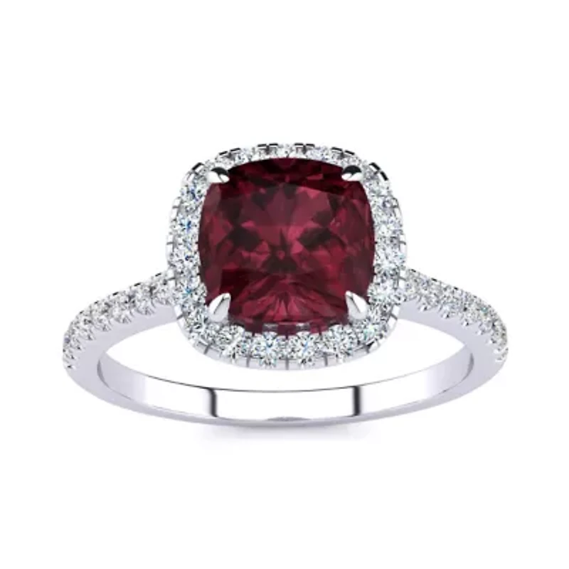This garnet ring features one 7mm cushion cut garnet gemstone. It is surrounded by 38 sparkling diamonds totaling 1/2 carat in I-J color, I1-I2 clarity. Total carat weight is approximately 2 carats. This ring is in sterling silver. 39 Color rating: I Clarity rating: I1-I2 Polished finish Prong setting Choking hazard Warranty available, Limited liability warranty, 60 Days China Imported Belk Exclusive Product Specifications 9x9mm 2 Carats Material & Care Metal, Sterling silver Use silver polishing cloth on silver items.