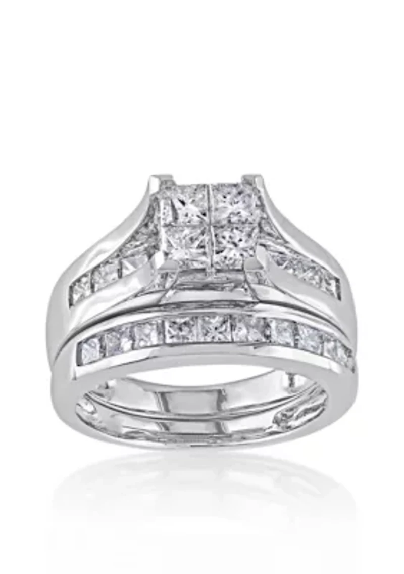 This 2.00 ct. t.w. diamond bridal ring set crafted in 14k white gold features an engagement ring with a 4/5 ct. t.w. cluster of princess cut, center diamonds enhanced with princess cut side diamonds and measures 18.80-mm. x 10.00-mm. The matching wedding band features princess cut diamonds. Invisible and channel setting 23 Diamonds Color G-H and Clarity I1-I2 Imported Care Clean with a soft bristle brush or cloth and warm soapy water. Use gold polishing cloth on gold items.