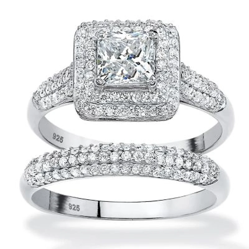 The never-fail elegance of this cubic zirconia two-piece wedding ring set dazzles with 1.67 carats T.W. This contemporary ring set uses micro pave to sparkle even brighter with rows of shimmering round cubic zirconia accents. Platinum-plated sterling silver design. Sizes 5-10.Main Stone: 1 Princess Faceted Cut Cubic Zirconia, .90 carat, 5.5 mm x 5.5 mmAccent Stone: 153 Cubic Zirconias .77 cttwPlatinum-Plated Sterling Silver; Contains 4.80 grams of Sterling SilverRing: 10 mm wide x 12 mm long x 7.5 mm high; Shank Width: 4.0 mm wide; 3 mm wide x 12 mm long x 2 mm highIncludes gift box and drawstring pouchPlatinum-Plated Sterling SilverContains 4.80 grams of Sterling SilverShank Width: 4.0 mm wideRing Dimensions: 10 mm wide x 12 mm long x 7.5 mm high, Ring Dimensions: 3 mm wide x 12 mm long x 2 mm highIncludes gift box and drawstring pouch 2 154 Polished finish Warranty available China Imported Product Specifications 0.69 in x 0.47 in x 0.39 in 1.665 Material & Care Metal, Sterling silver Clean with a soft cloth.
