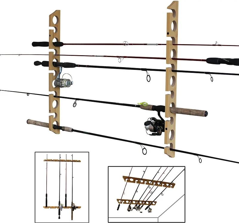 Organize your fishing equipment with the 2-Piece 3-in1 11-Rod Wall or Ceiling Rod Rack. The rack is built to hold up to 11 rod and reel combos, and the 2-piece construction offers vertical or horizontal mounting for versatile placement. The 6 removable handle resting caps gently cradle your rod handles to help protect your gear.