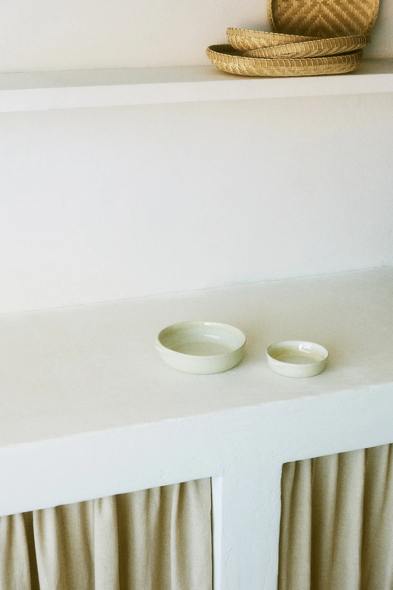 Set of two stoneware baking dishes with a reactive glaze that creates beautiful, variegated coloring, giving each piece a unique appearance. Subtle handles and a nested shape save space when not in use. Small dish dimensions: height 1 1/2 in. Diameter 6 in. Large dish dimensions: height 2 1/4 in. Diameter 8 3/4 in.