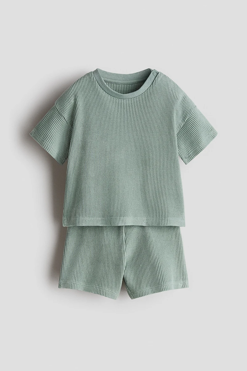 Set with a T-shirt and shorts in waffled cotton jersey. T-shirt with concealed snap fastener on one shoulder (sizes 2–4Y without snap fastener). Shorts with a soft, elasticized waistband.