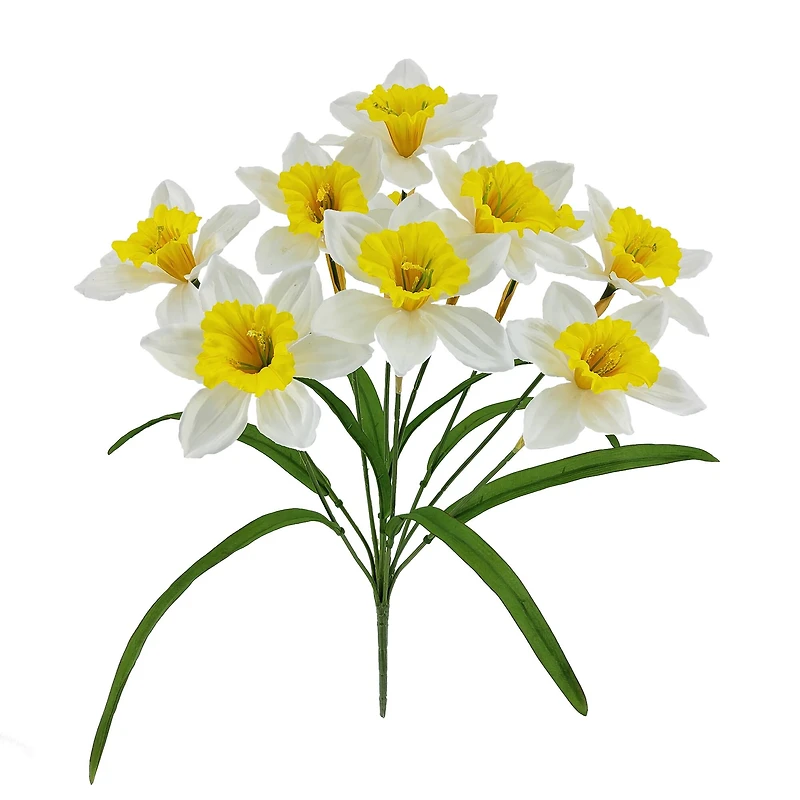 Add a lovely, delicate touch to your spring floral arrangements and décor projects with this pretty daffodil bush from Ashland. Showcase these eye-catching blooms along with bright daisies, lively foliage and ribbon in a glass vase set on an end table in your living room.Details:Available in multiple colors10" x 6" x 20" (25.4cm x 15.2cm x 50.8cm)Polyester, plastic and iron wireRecommended for indoor use only