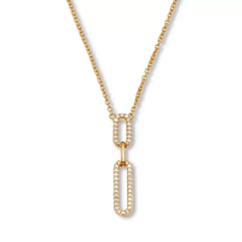 Achieve a designer look with this elegant paperclip drop necklace. Featuring sparkling cubic zirconia stones, this stylish necklace provides eye-catching shine with every moment. A must-have accessory for any follower of fashion. .20 carat T.W. 18k yellow gold-plated. 18 inch length with 2 inch extension and lobster clasp.40 Round Faceted Cut Cubic Zirconias, .20 carat total weight, 1 mm x 1 mm18k Gold-PlatedDimensions: 6 mm wide x 18 inches long x 31 mm highIncludes gift box and drawstring pouch18k Gold-PlatedDimensions: 6 mm wide x 18 inches long x 31 mm highIncludes gift box and drawstring pouch Lobster closure, 40 Polished finish Warranty available China Imported Product Specifications 1.46 in x 18 in x 0.24 in, 18" length 0.2 Material & Care Metal, Gold plated Clean with a soft cloth.