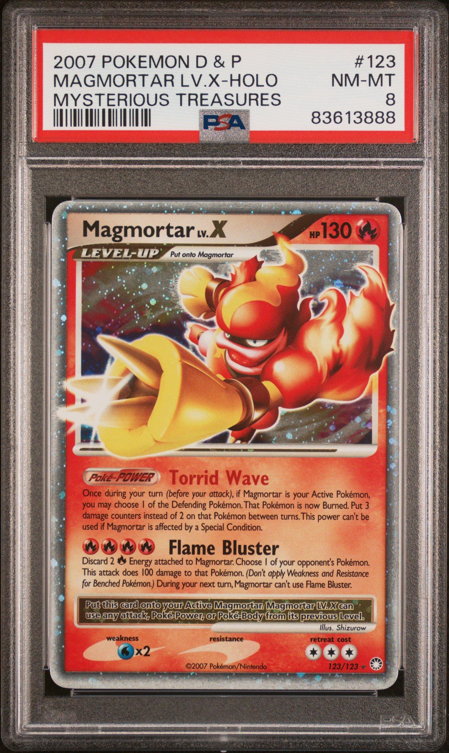 2007 Pokemon Diamond & Pearl Mysterious Treasures 123 Magmortar Lv.x-holo PSA 82007 Pokemon Diamond & Pearl Mysterious Treasures 123 Magmortar Lv.x-holo PSA 8