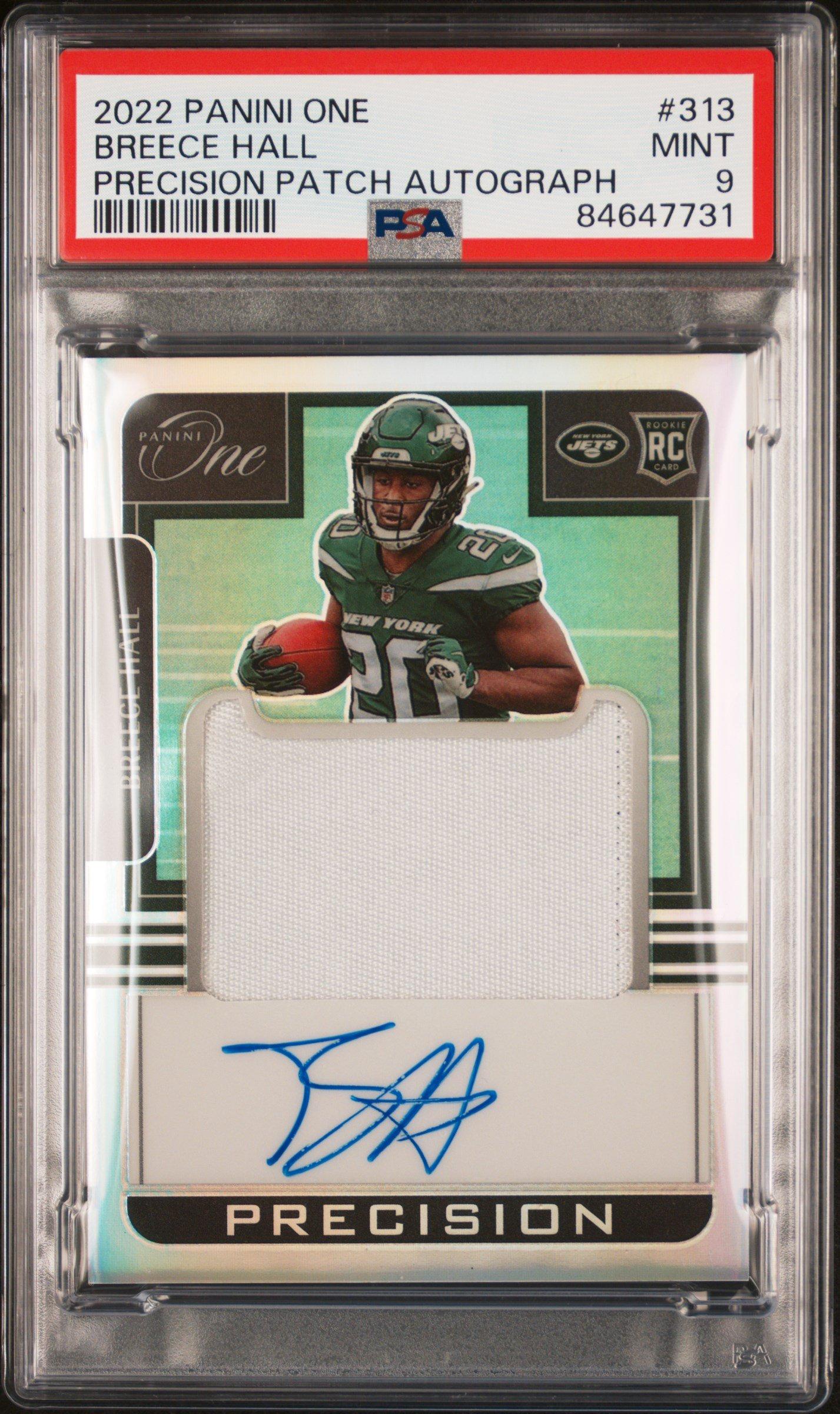 2022 Panini One 313 Breece Hall Precision Patch Autograph PSA 9