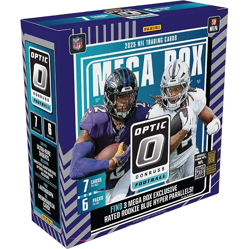 No returns on trading cards.​ ​The 2024 Panini NFL Donruss Optic Football Mega Box is a premium offering for collectors and fans alike. Each box contains 6 packs with 7 cards per pack, totaling 35 cards. On average, each box includes one autograph or memorabilia card, adding excitement to every unboxing experience. Find three (3) Mega exclusive Rated Rookie Blue Hyper Parallels, and one (1) Autograph or Memorabilia per box, on average! Find Ultra-Rare, highly sought-after Downtowns, Downtown Duos, Uptown, Hash Marks, and more!This Mega Box is a must-have for those looking to enhance their NFL trading card collection.