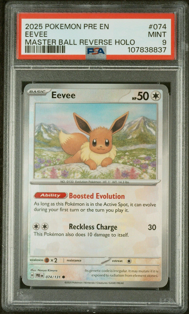2025 Pokemon Pre En-prismatic Evolutions 074 Eevee Master Ball Reverse Holo PSA