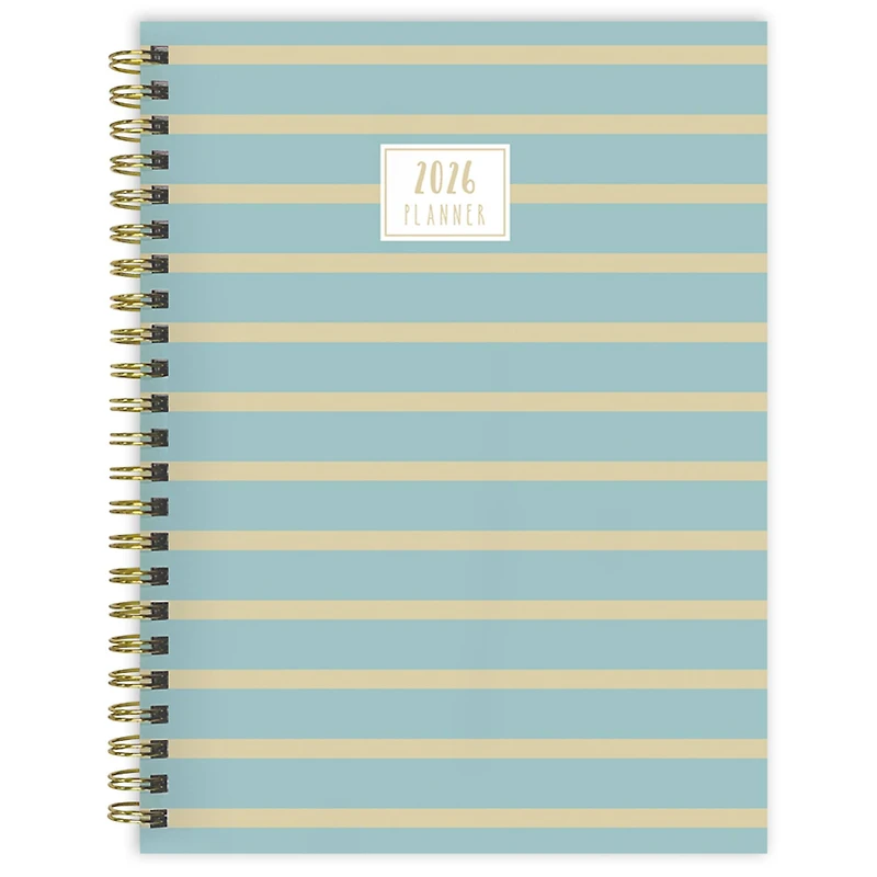 Make every day a good one with our medium, 6.5" (w) x 8" (h) planner featuring a blue and gold striped cover design. This planner boasts monthly 2-page spreads - one page with a calendar grid overview and the other page includes space to write goals and notes, plus reminders to improve organization and task mastery. Weekly 2-page spreads are lined and segmented for each day’s plans; it also includes a lined space for weekly priorities. All interior planning pages are designed with a playful and colorful feel and feature faux monthly tabs for easy access to weekly planning. Bonus lined notes pages are in the back and yearly 2026 and 2027 views are included in the front. The monthly boxes measure 1.1" (w) x 1.25" (h). The planner has a durable cover with coordinating gold wire-o binding to lay flat when open and includes 216 color coordinating stickers. This 12-month planner covers the months of January 2026 - December 2026 and contains no plastic. Printed on FSC-certified paper.