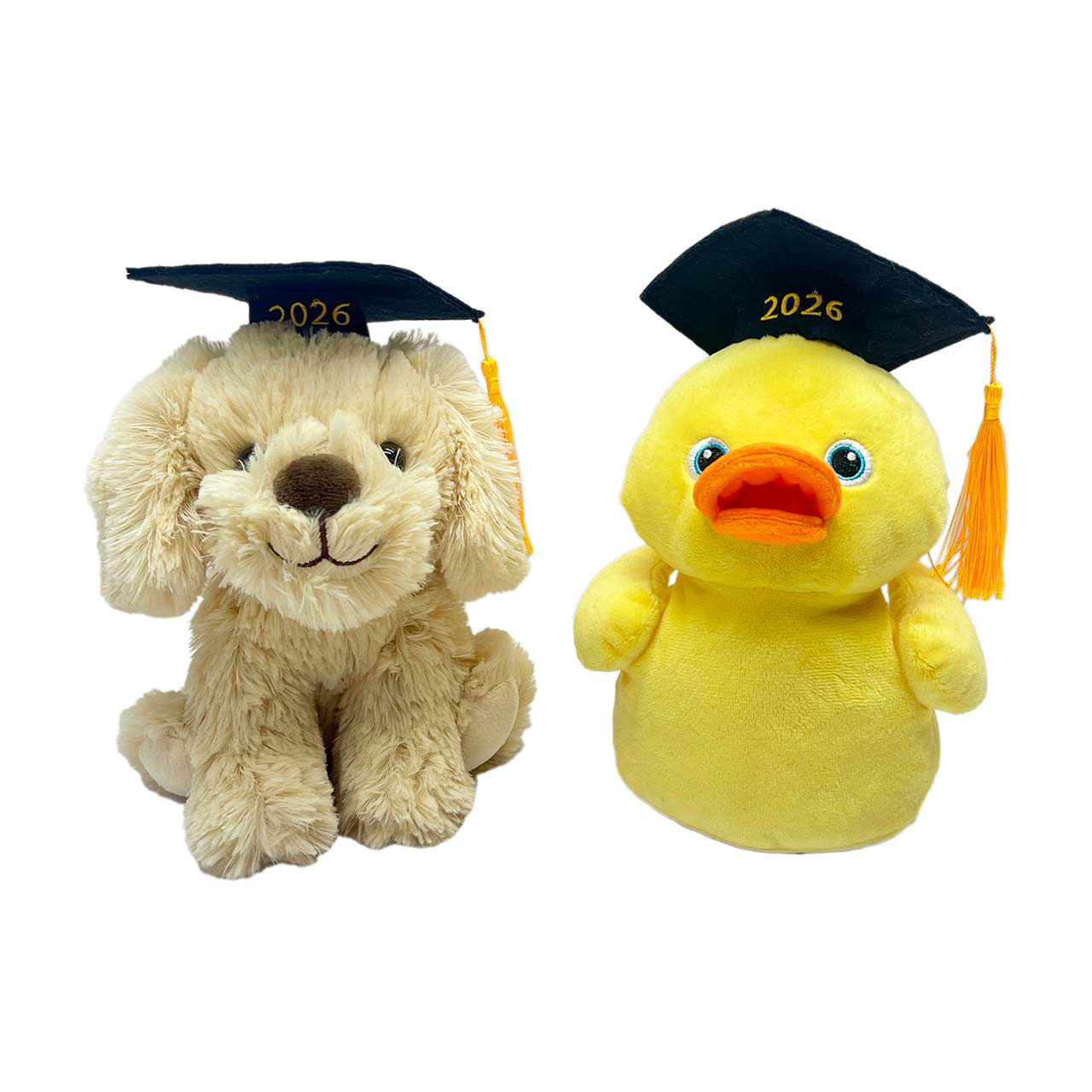 Choose between two delightful options: a cuddly beige dog with fluffy ears and a friendly smile, or a vibrant yellow duck with a cheerful expression and bright orange beak. Each plush toy proudly wears a classic black graduation cap adorned with the year "2026" in golden embroidery, complete with a fun tassel to mark the momentous event.