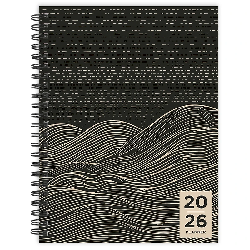 Go with the flow! Our medium, 6.5" (w) x 8" (h) planner with a rolling wave cover design boasts monthly 2-page spreads-one page with a calendar grid overview and the other page includes space to write goals and notes, plus reminders to improve organization and task mastery. Weekly 2-page spreads are lined and segmented for each day’s plans; it also includes a lined space for weekly priorities. All interior planning pages are printed on a clean kraft paper and feature faux monthly tabs for easy access to weekly planning. Bonus lined notes pages are in the back and yearly 2026 and 2027 views are included in the front. The planner has a durable cover with coordinating black wire-o binding to lay flat when open and includes 216 color coordinating stickers. The monthly boxes measure .75" (w) x 1.3" (h). This 12-month planner covers the months of January 2026 - December 2026 and contains no plastic. Printed on FSC-certified paper.
