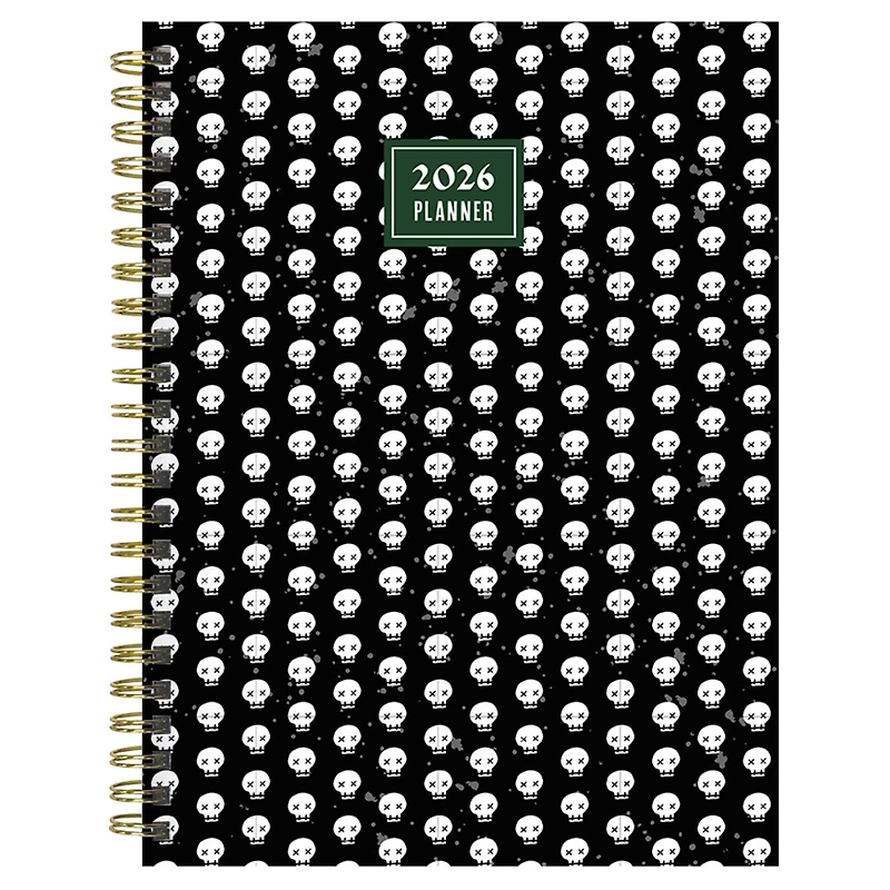 Channel your inner goth with our medium weekly monthly planner featuring a modern skull cover design! Measuring 6.5" (w) x 8" (h), the all-encompassing planner boasts 2-page monthly spreads that include lined sections for notes, tasks, and goals and 2-page weekly spreads with lined daily sections to keep plans neat and organized. Plus, a dedicated weekly priorities section to help you stay focused! The interior pages are designed with a dark and moody feel, accented with faux monthly tabs for easy access to weekly planning. Enhance your daily plans with 216 color coordinating stickers to highlight special occasions and personalize your planner. Bonus lined notes pages are in the back with yearly 2026 and 2027 views in the front. The monthly boxes measure .75" (w) x 1.25" (h). Featuring a durable cover and gold wire-o binding designed to lay flat when open, this 12-month planner covers January 2026 – December 2026 and includes a plastic free cover and is fully recyclable! Printed on FSC-certified paper.