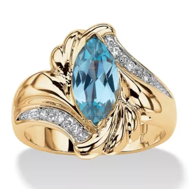 The highly polished golden hue of this spectacular cocktail ring is the perfect backdrop for the serene aqua blue cubic zirconia marquise center. White cz accents add extra sparkle, for a total of 2.05 carats. This beauty will add a little glamour to your every day wardrobe. Gold-plated. Sizes 6-10. Main Stone: 1 Marquise Faceted Cut Blue Cubic Zirconia, 2.00 carats, 12 mm x 6 mmAccent Stone: 6 Cubic Zirconias .05 cttw14k Gold-Plated, SilvertoneMeasures: 21 mm wide x 17 mm long x 5.5 mm high; Shank Width: 3.0 mm wideIncludes gift box and drawstring pouch14k Gold-Plated, SilvertoneShank Width: 3.0 mm wideDimensions: 21 mm wide x 17 mm long x 5.5 mm highIncludes gift box and drawstring pouch 7 Polished finish Warranty available China Imported Product Specifications 2.054 Material & Care Metal, Gold plated Clean with a soft cloth.