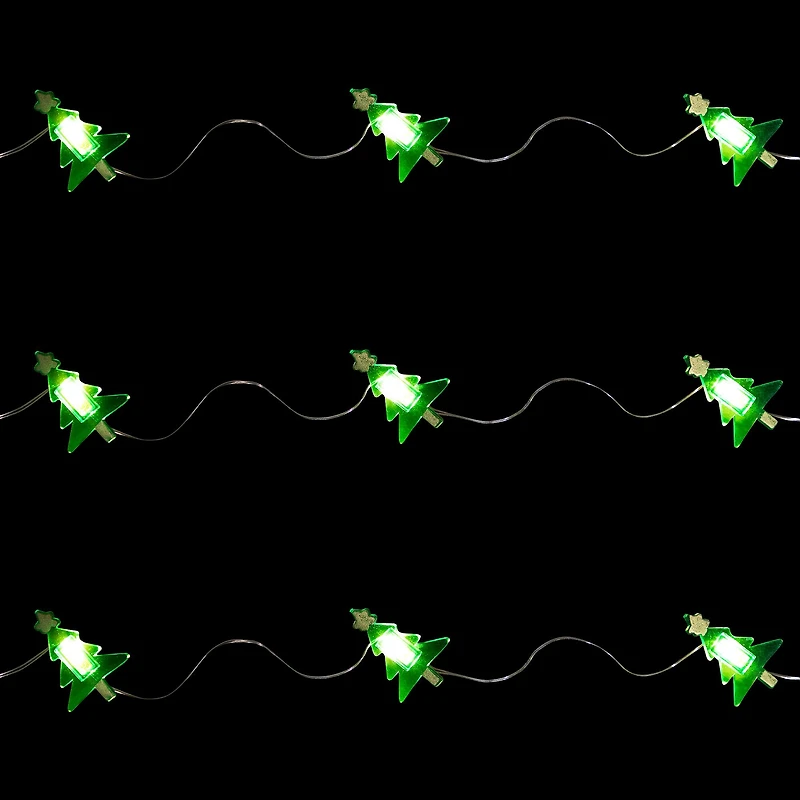 These firm Christmas tree-shaped fairy lights will bring your Christmas décor to life. These extremely flexible lights are easy to stretch and form to fit your decoration needs. It is perfect for adding some holiday magic to your wreaths trees garland or for lending some sparkle to your lanterns and vases. Details:Warm white bulbs, green trees and silver wire20 micro fairy bulbs6 ft. lighted length7 ft. total length12" lead cord4" between each bulbBattery operatedRequires 3 AA batteries (not included)On/off switch on battery packNon-replaceable bulbsFor indoor use only