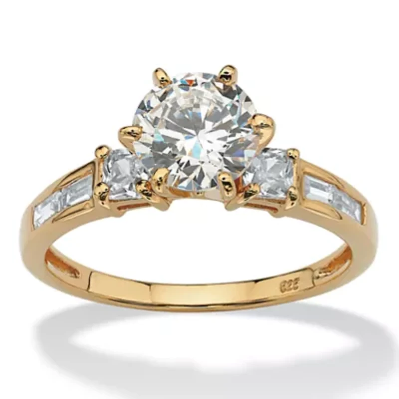 Contemporary yet classic round cubic zirconia ring is treated to a stunning combination of princess-cut and baguette cubic zirconia accents for a fashionable designer-inspired look. 2.14 carats T.W. 14k gold-plated sterling silver. Sizes 6-10. (All carat weights are approximate and may vary slightly from those listed.)Main Stone: 1 Round Brilliant Cut Cubic Zirconia, 1.50 carats, 7 mm x 7 mmAccent Stone: 6 Cubic Zirconias .64 cttw14k Gold-Plated Sterling Silver; Contains 1.90 grams of Sterling SilverMeasures: 19 mm wide x 6 mm long x 7.5 mm high; Shank Width: 1.5 mm wideIncludes gift box and drawstring pouch14k Gold-Plated Sterling SilverContains 1.90 grams of Sterling SilverShank Width: 1.5 mm wideDimensions: 19 mm wide x 6 mm long x 7.5 mm highIncludes gift box and drawstring pouch 7 Polished finish Warranty available Thailand Imported Product Specifications 1.04 in x 0.24 in x 0.75 in 2.14 Material & Care Metal, Sterling silver Clean with a soft cloth.