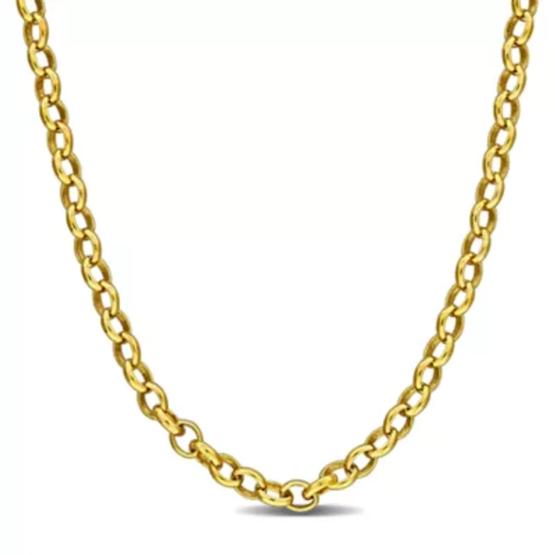 Warm golden tones enhance the classic appeal of this 2.1 millimeter rolo chain, designed with evenly polished round links that create a smooth and balanced silhouette. Crafted in yellow sterling silver, the chain reflects light with a soft, elegant glow while offering lasting durability. The spring ring clasp provides secure closure with a refined finish. Available in multiple lengths, this versatile piece can be worn alone for timeless simplicity or layered effortlessly for a more personalized look, making it an essential addition to any jewelry collection. Spring ring clasp Polished finish Warranty available, 60 days Italy Imported Product Specifications 18" Material & Care Sterling Silver Metal, Sterling silver Clean with a soft cloth.